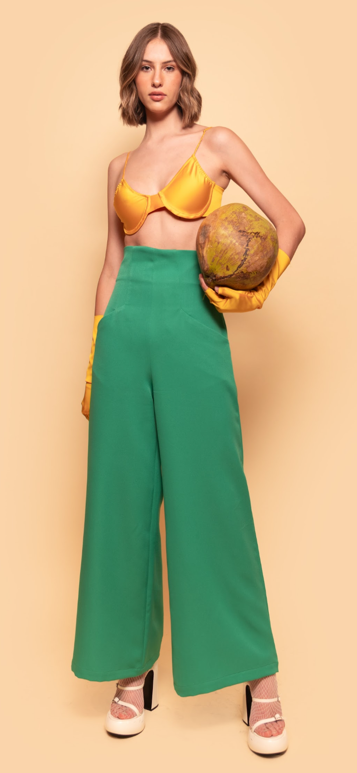 Nuestro clásico Adrienne B.R.A. regresa en un tono verde vibrante que evoca la energía tropical de Brasilia. Con talle alto y pierna ancha, está confeccionado en crepé fluido que aporta movimiento y elegancia. Un básico atemporal con el giro perfecto para climas cálidos y looks color-block.