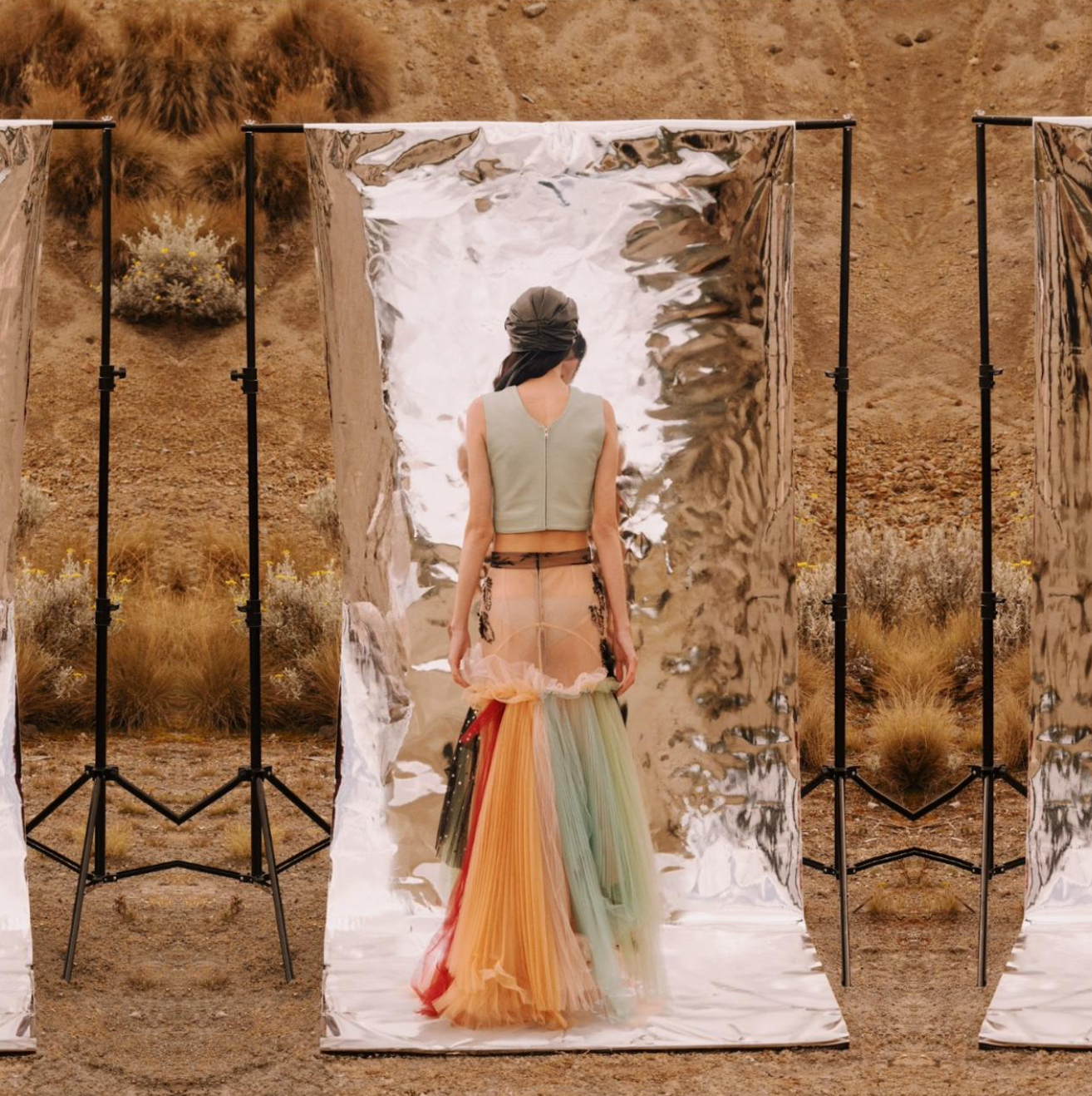 Una prenda que parece flotar entre la naturaleza y el arte textil. Silueta de sirena que se transforma en un estallido de capas asimétricas en tul plisado. Los paneles en tonos pastel —como coral, menta, marfil, negro con lunares y rosa— aportan movimiento, textura y un aire poético.