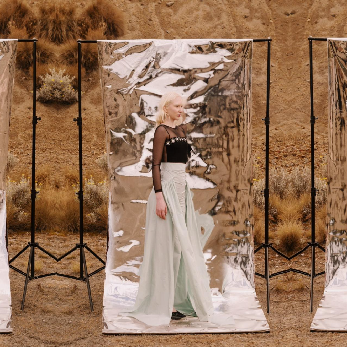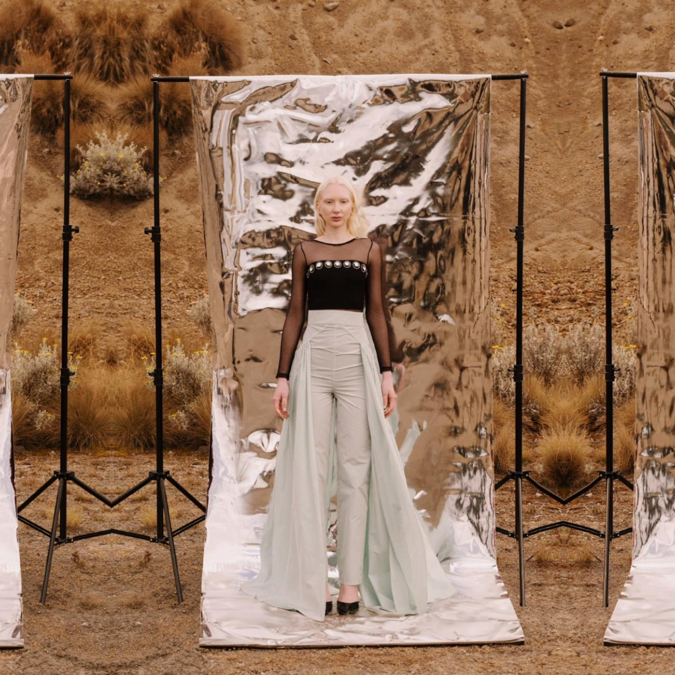 Un statement piece que reinventa la silueta clásica con un giro teatral. Este pantalón de tiro alto en tono verde menta, una estructura sastre impecable con pinzas frontales que definen la figura.