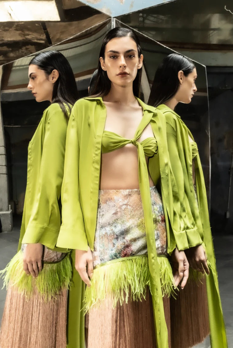Falda de encaje rebordado con lentejuelas metalicas, flecos y plumas.