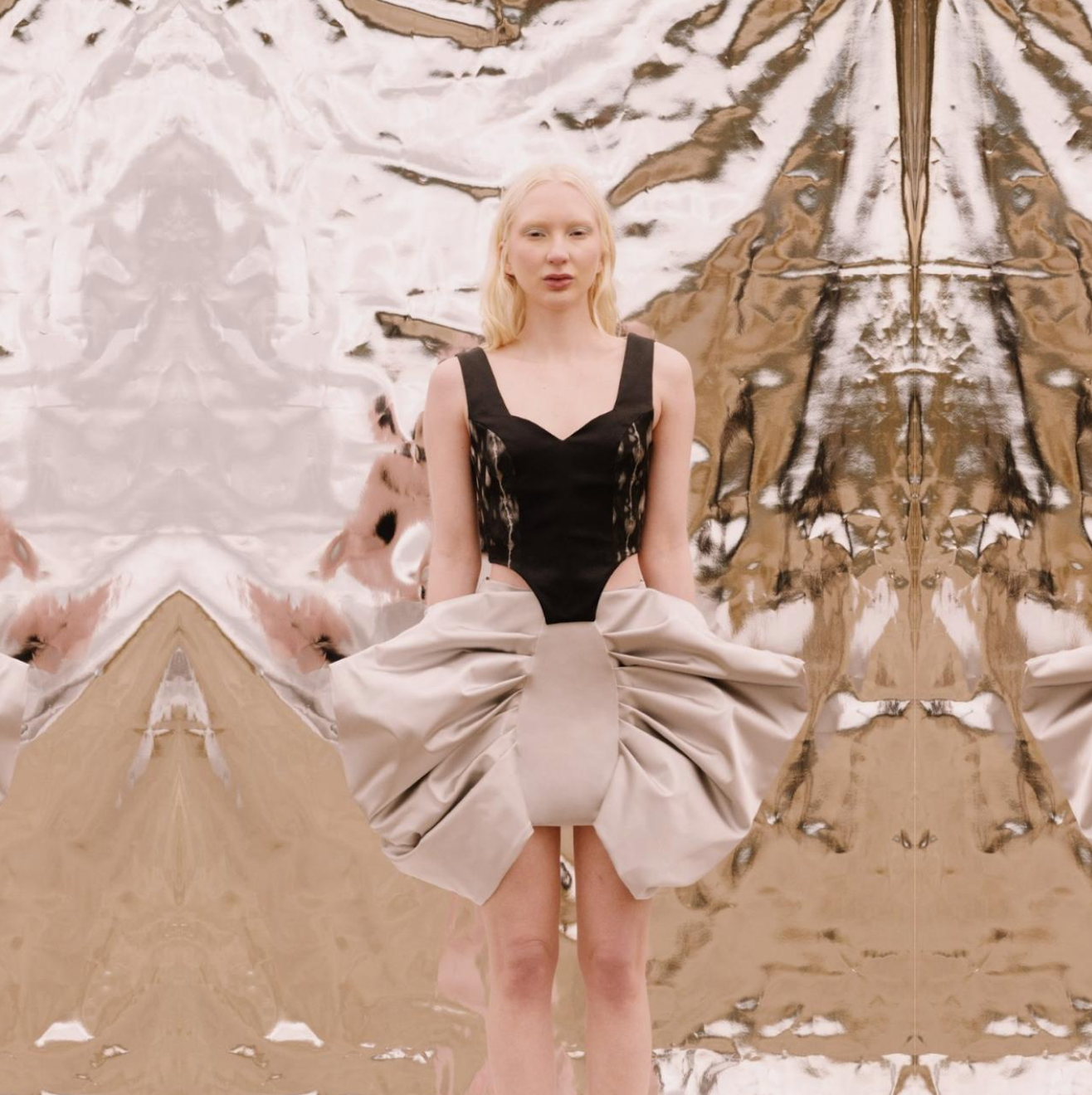 Corset estructurado confeccionado en charmeuse stretch negra con costadillos de seda teñida a mano, que aportan un contraste artístico y único.