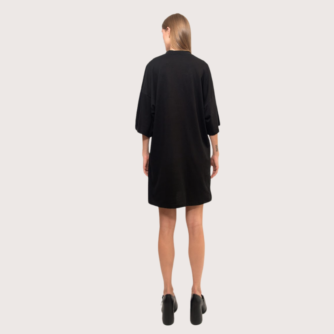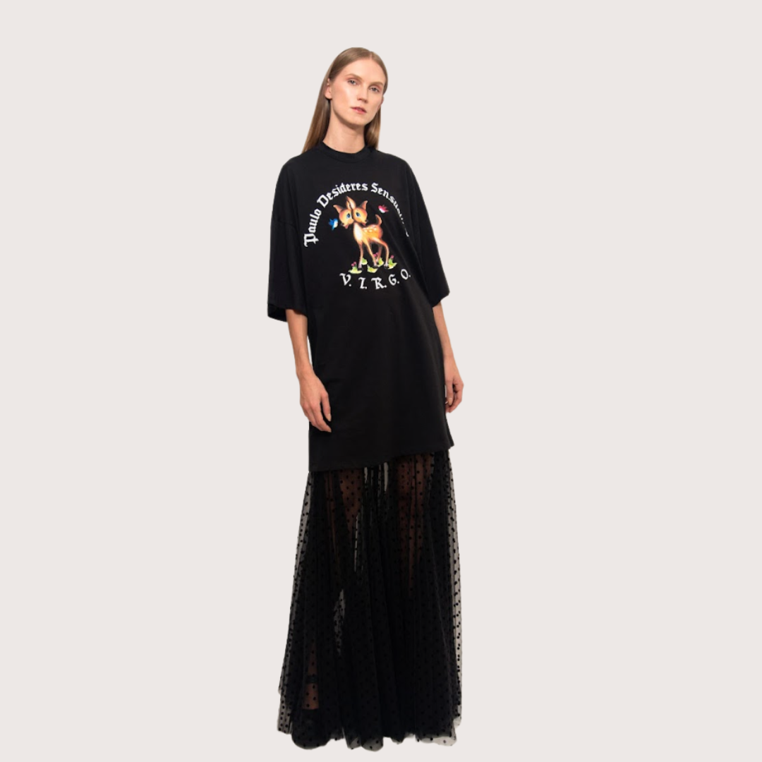 Playera oversized negra, sublimada con un diseño de autoría, es una prenda con fluidez y caída ideal para todo tipo de cuerpo, que busca darle un giro a lo casual.