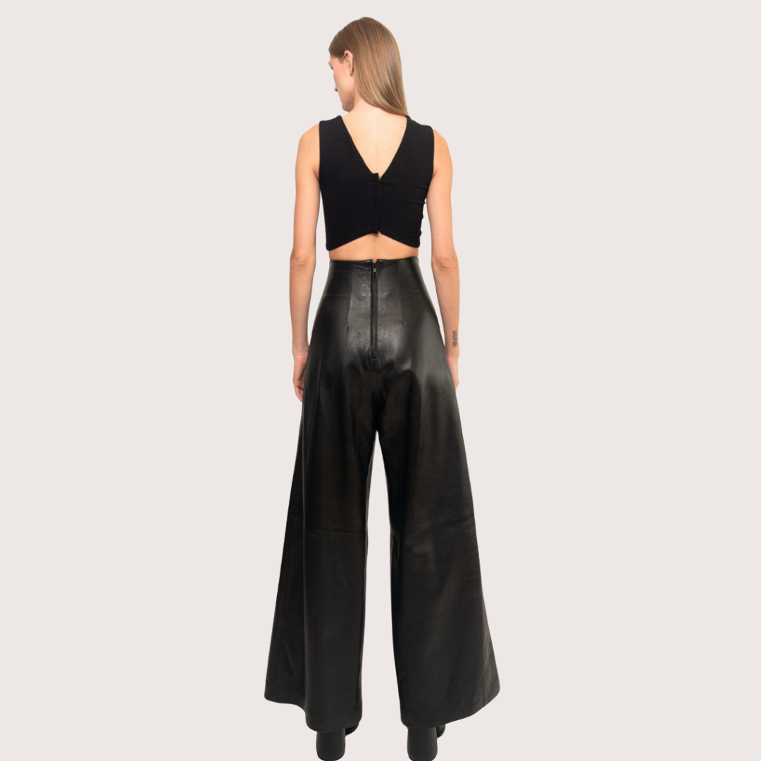 Pantalón wide leg, tiro alto con pinzas y cierre trasero, patronado con el enfoque principal de estilizar la figura, alargando estratégicamente la silueta. Creando una prenda de sastrería impecable que rompe lo convencional con la integración de la piel.