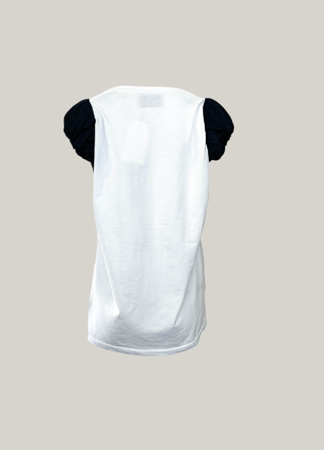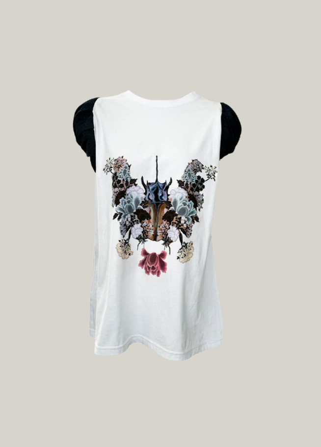 Pieza insignia de la colaboración entre Claudia Álvarez y Alexia Ulibarri, esta camiseta de algodón blanco captura la esencia del proyecto: arte, símbolo y estilo. El escarabajo al centro, dibujado a mano por Alexia, representa un talismán de suerte para Claudia, rodeado de un jardín onírico en tonos pastel. Las mangas abullonadas en denim estructurado contrastan delicadamente, elevando la silueta con un guiño romántico y contemporáneo.