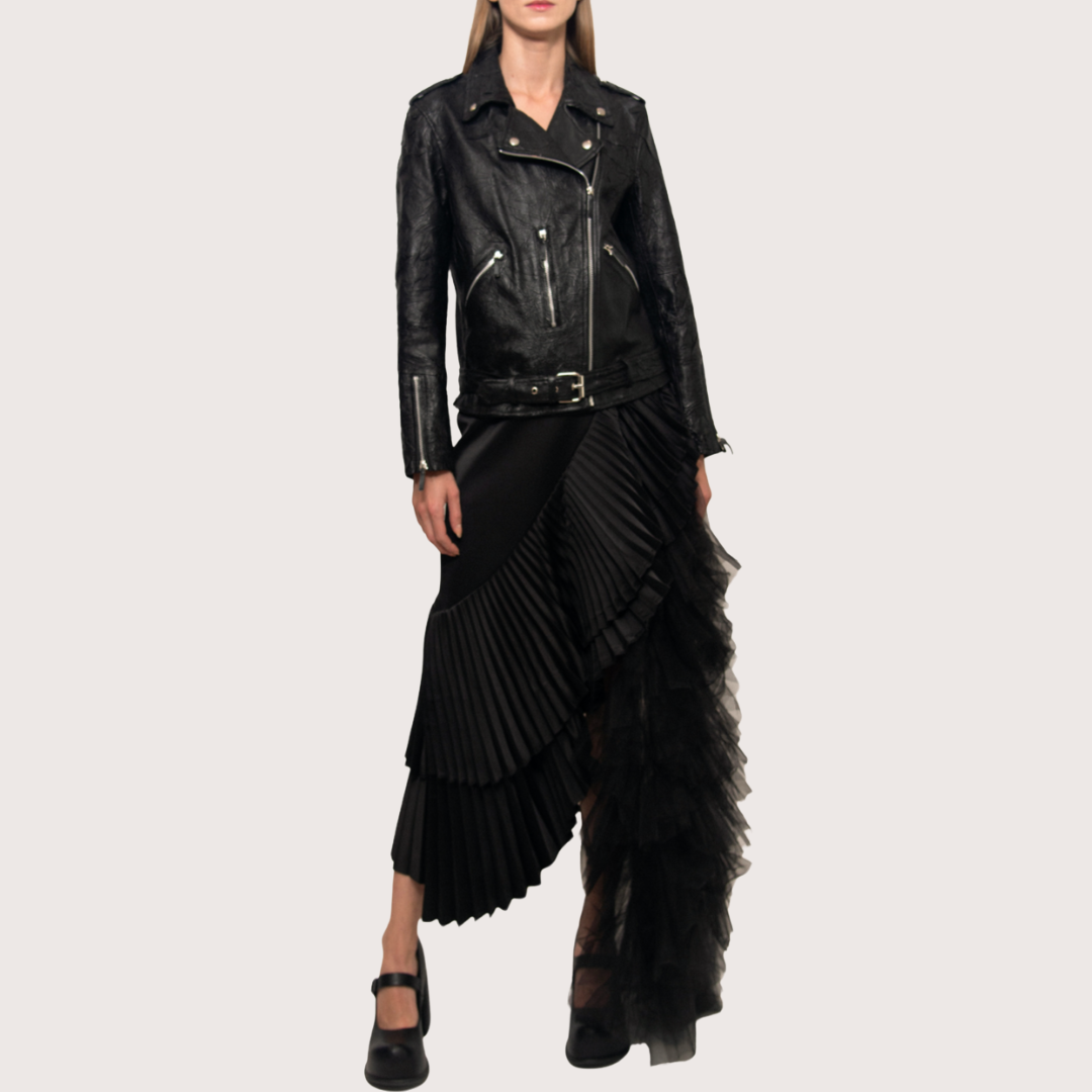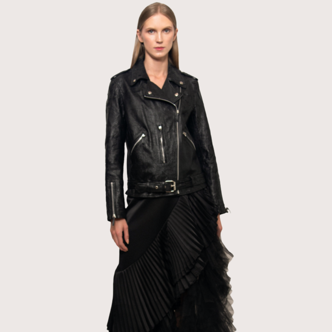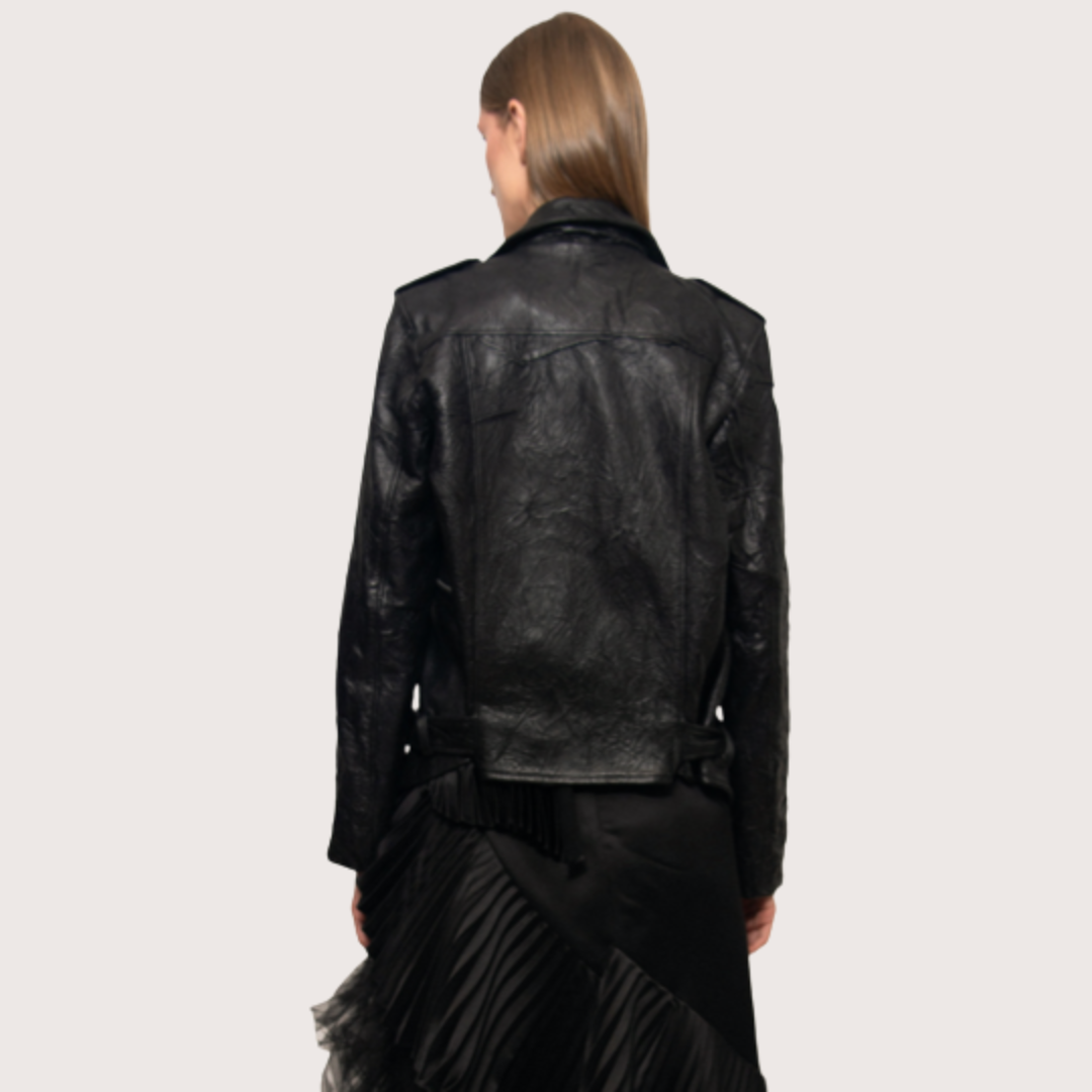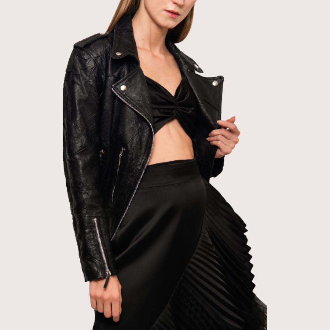 Chaqueta de piel efecto derretido, detalles en plateado que contrastan su construcción, para que al culminar todos los elementos se generé un básico único e interesante que todo clóset debería tener.