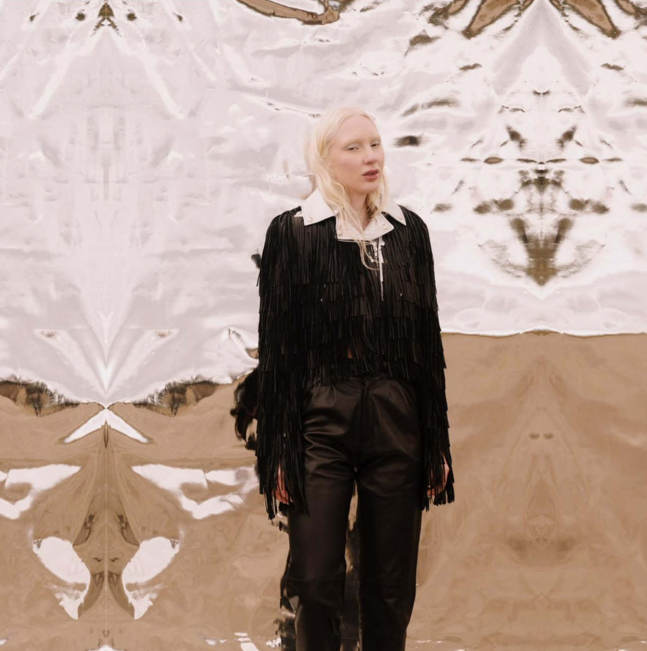Chaqueta biker cropped de cuero reciclado con flecos y cuello metálico – Alexia Ulibarri