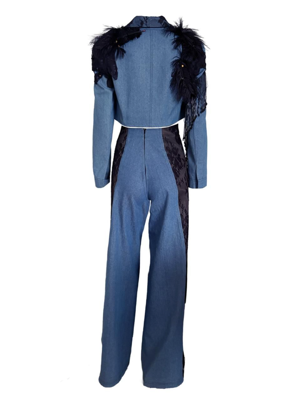 Este conjunto statement en denim redefine lo clásico con un giro dramático y artesanal. La chaqueta cropped en mezclilla azul está intervenida con aplicaciones de encaje negro y detalles de plumas que añaden textura y un aire teatral. El pantalón de pierna ancha incorpora un corset de amarras cruzadas en satén, creando un contraste de materiales que resalta la silueta y aporta un toque vanguardista.