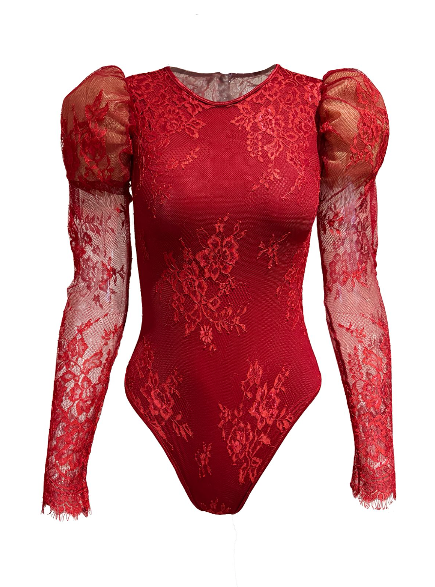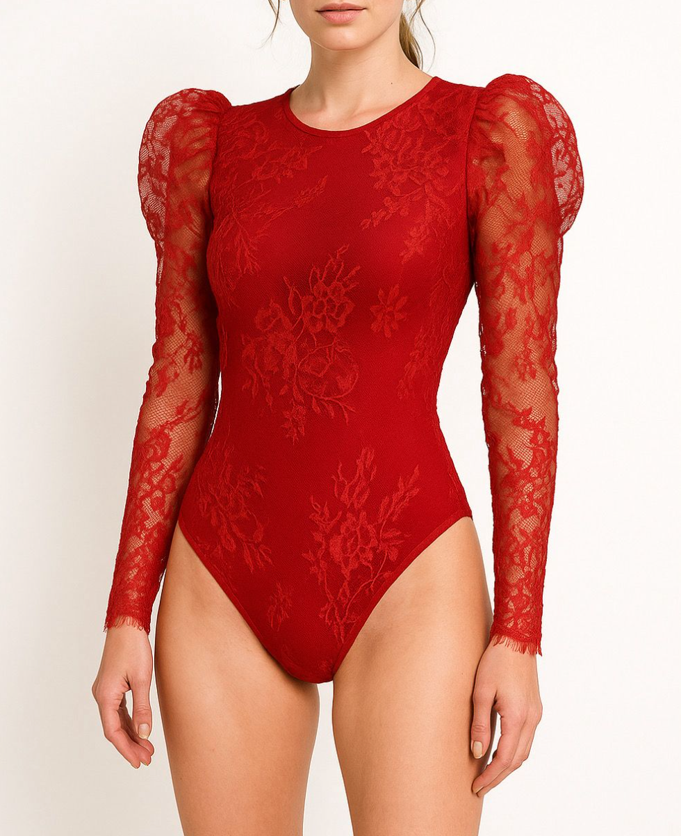 Body de encaje en tono vino, confeccionado con delicada mezcla de encaje floral y lycra que se adapta perfectamente al cuerpo. Presenta mangas largas con volumen en los hombros, un diseño sofisticado y femenino.