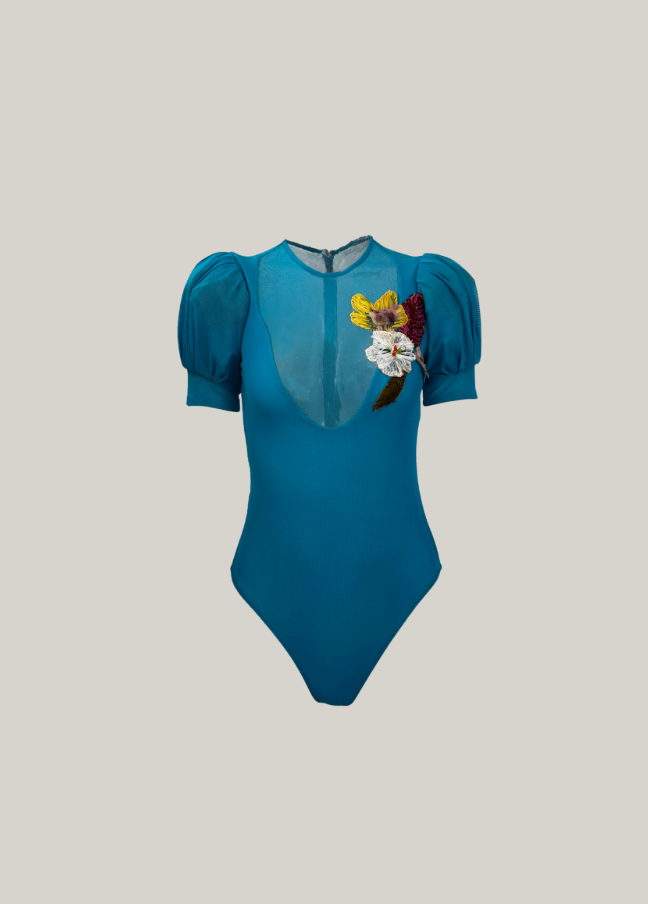 Body en mesh azul con bordado tropical hecho a mano.