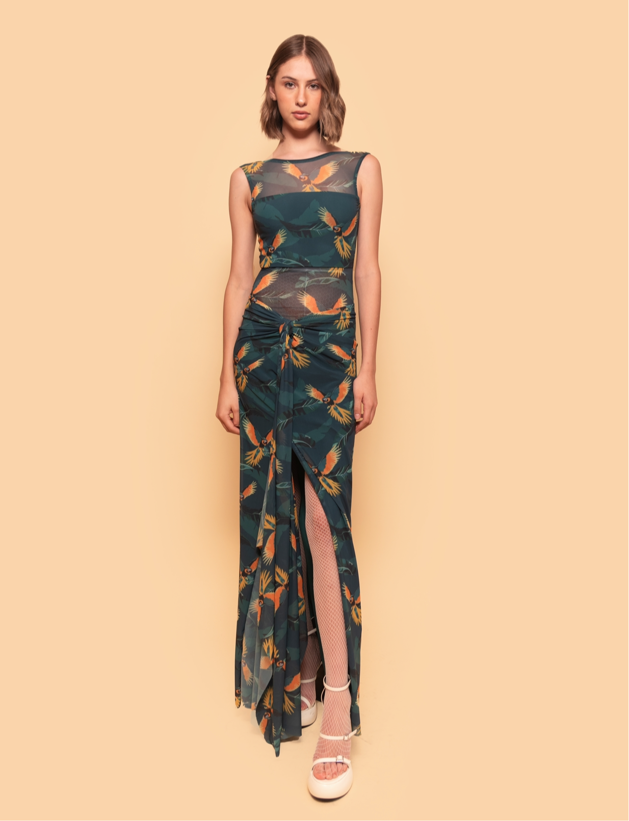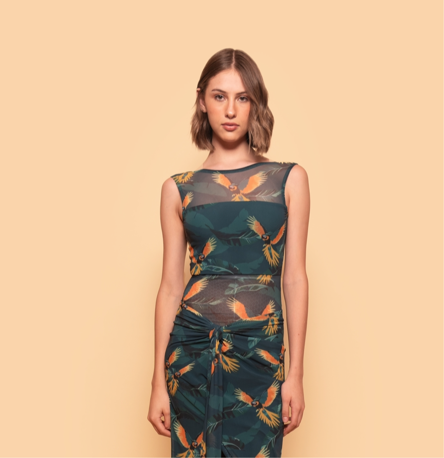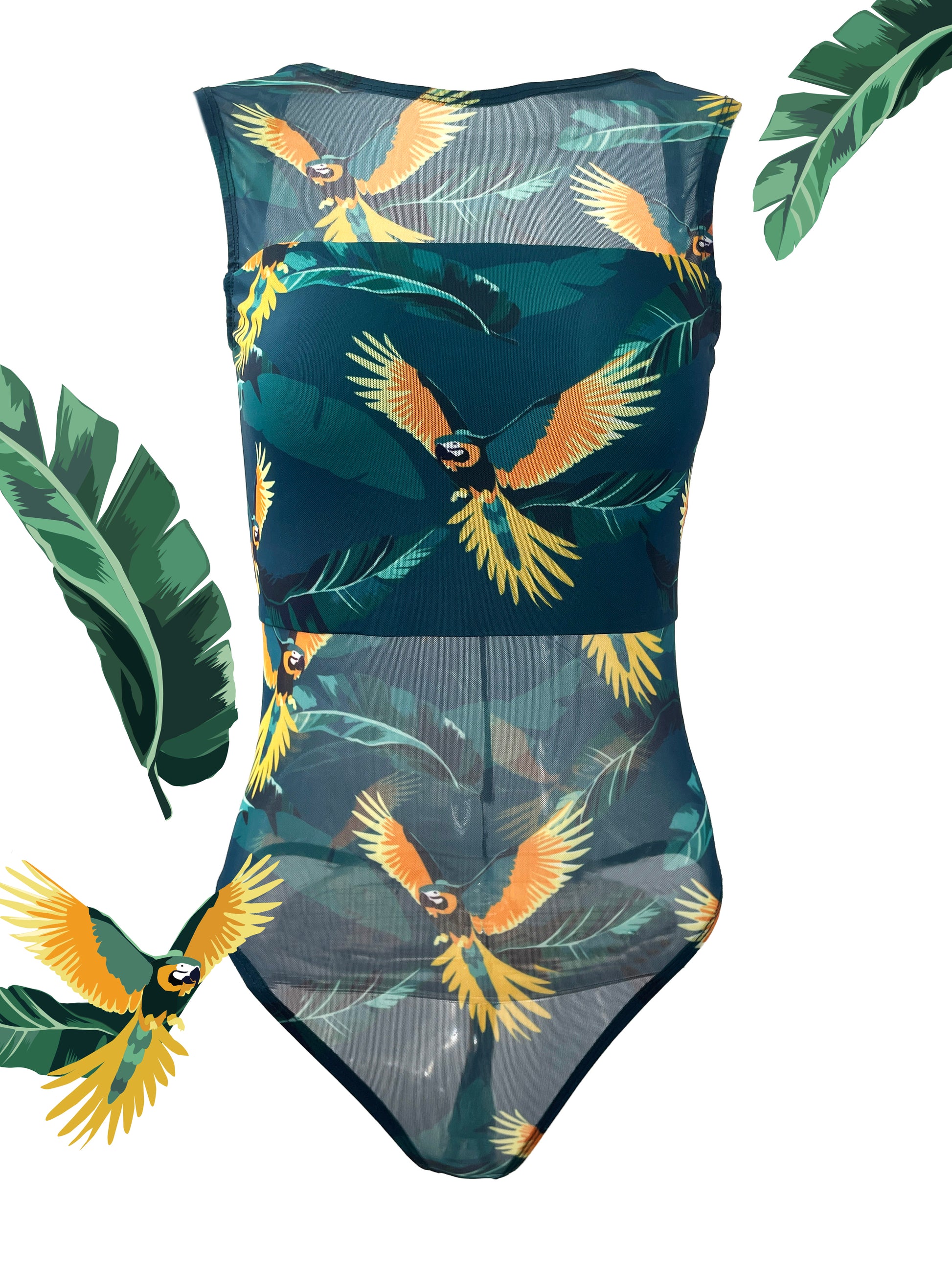 BODY DE MESH ESTAMPADO DE GUACAMAYAS SIN ESPALDA, BRALETTE DE LYCRA DOBLE