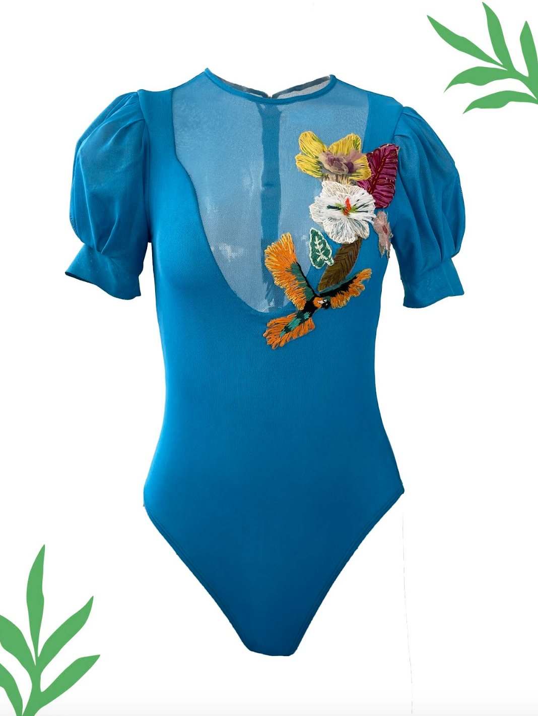 Body con espalda bordado a mano con flores y guacamaya TIPO GLOBO MESH Y LYCRA NYLON (LAVADO A MANO)