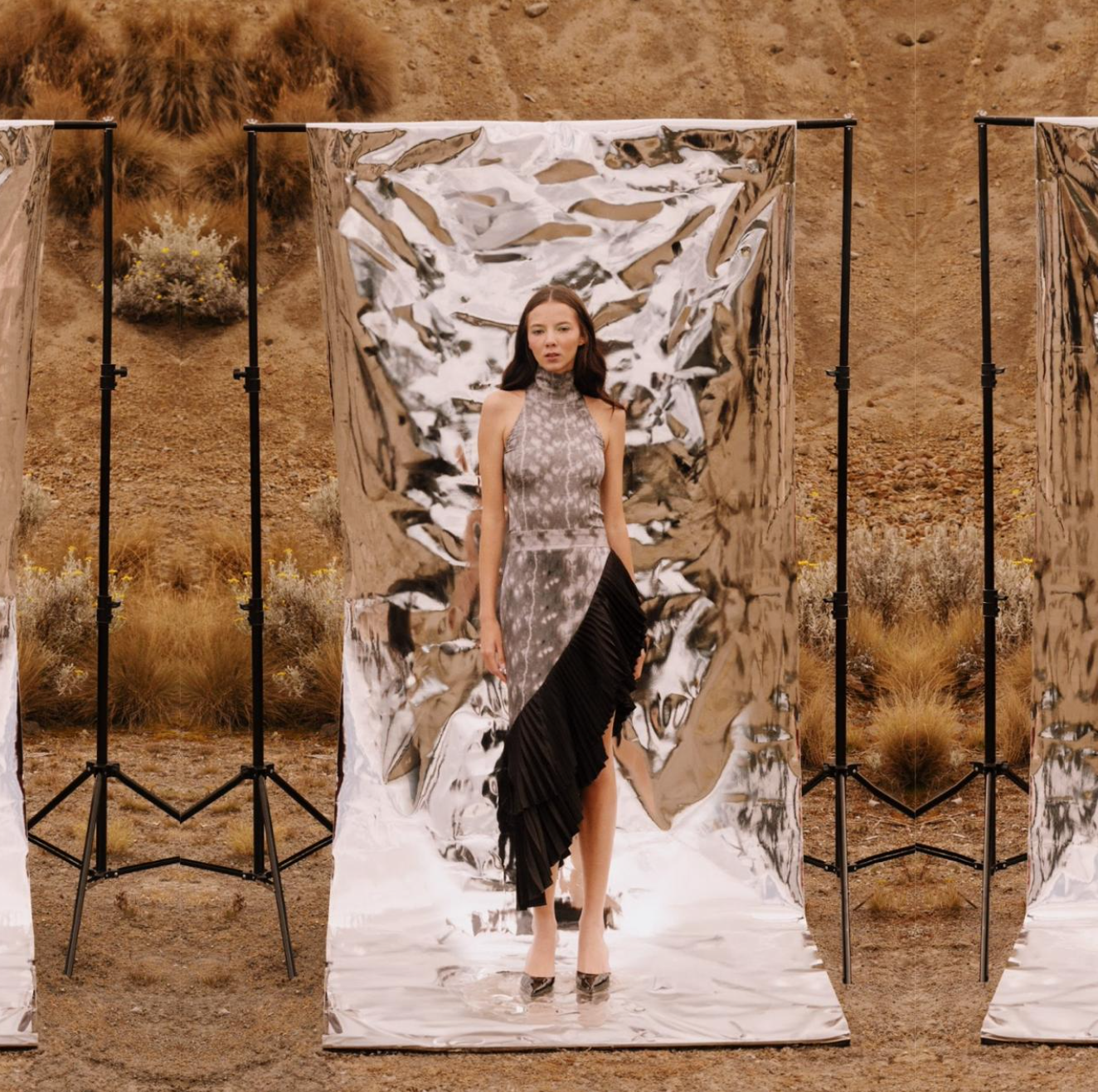 Este body de seda es una fusión entre sofisticación y diseño escultórico. Confeccionado en 95% seda stretch teñida a mano, presenta un efecto jaspeado en tono gris plata que aporta profundidad visual y un acabado único en cada pieza. Su cuello alto estructurado y corte “halter” sin mangas estilizan la silueta.