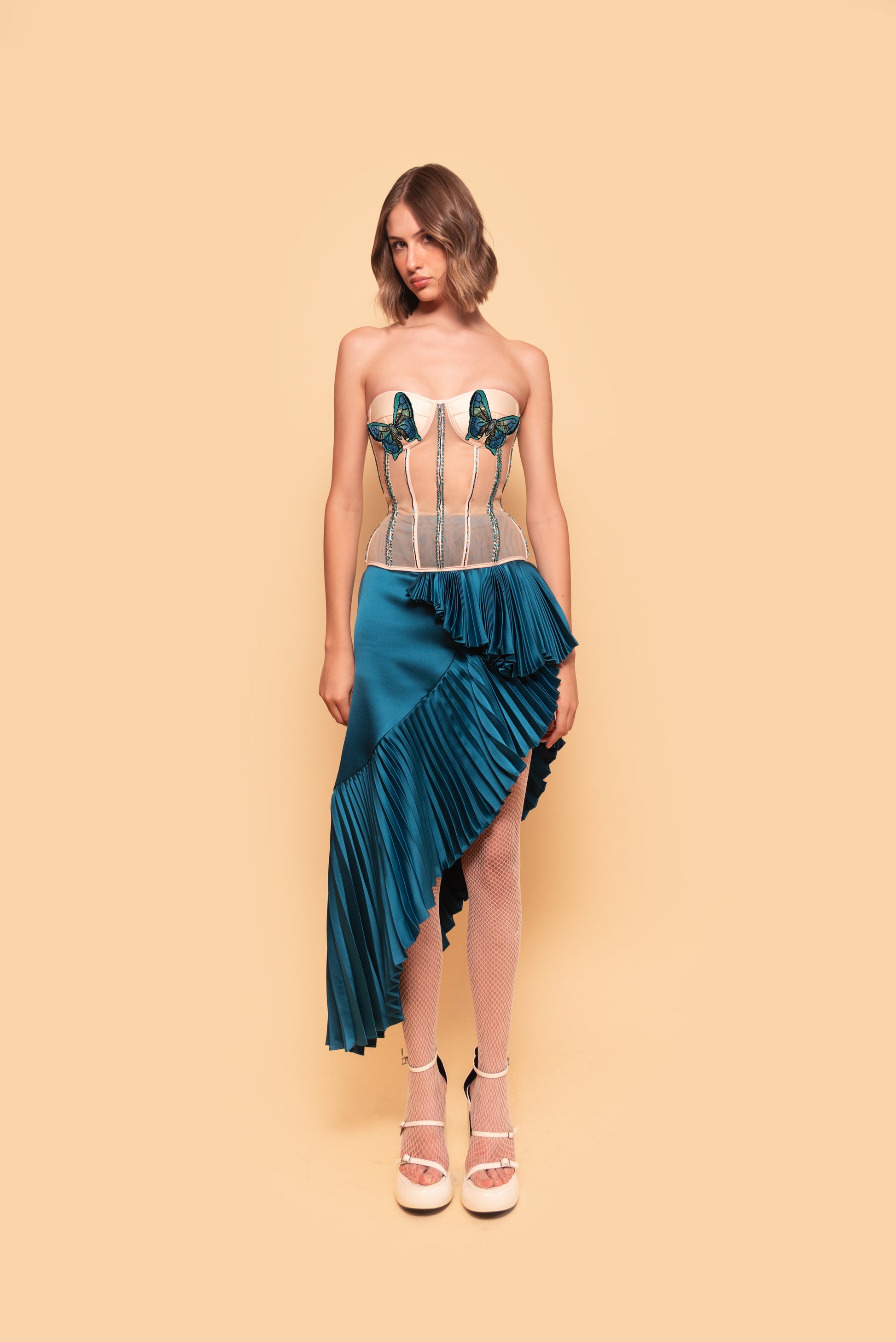 Structured corset in semi-sheer black organza with satin cups and exposed boning that enhances the silhouette. Each seam is delicately hand-embroidered with blue bugle beads to match the hand embroidered thread buterflies , adding a subtle yet refined shimmer. A standout piece that fuses classic tailoring with sensual elegance — perfect for night looks, editorials, or layered under oversized blazers.