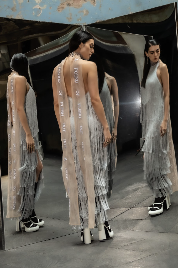 Vestido de flecos tipo halter con tiras de tull bordadas como detalle.