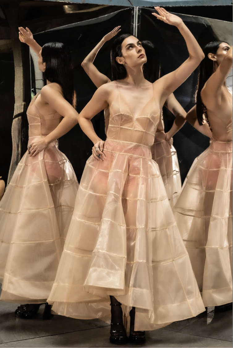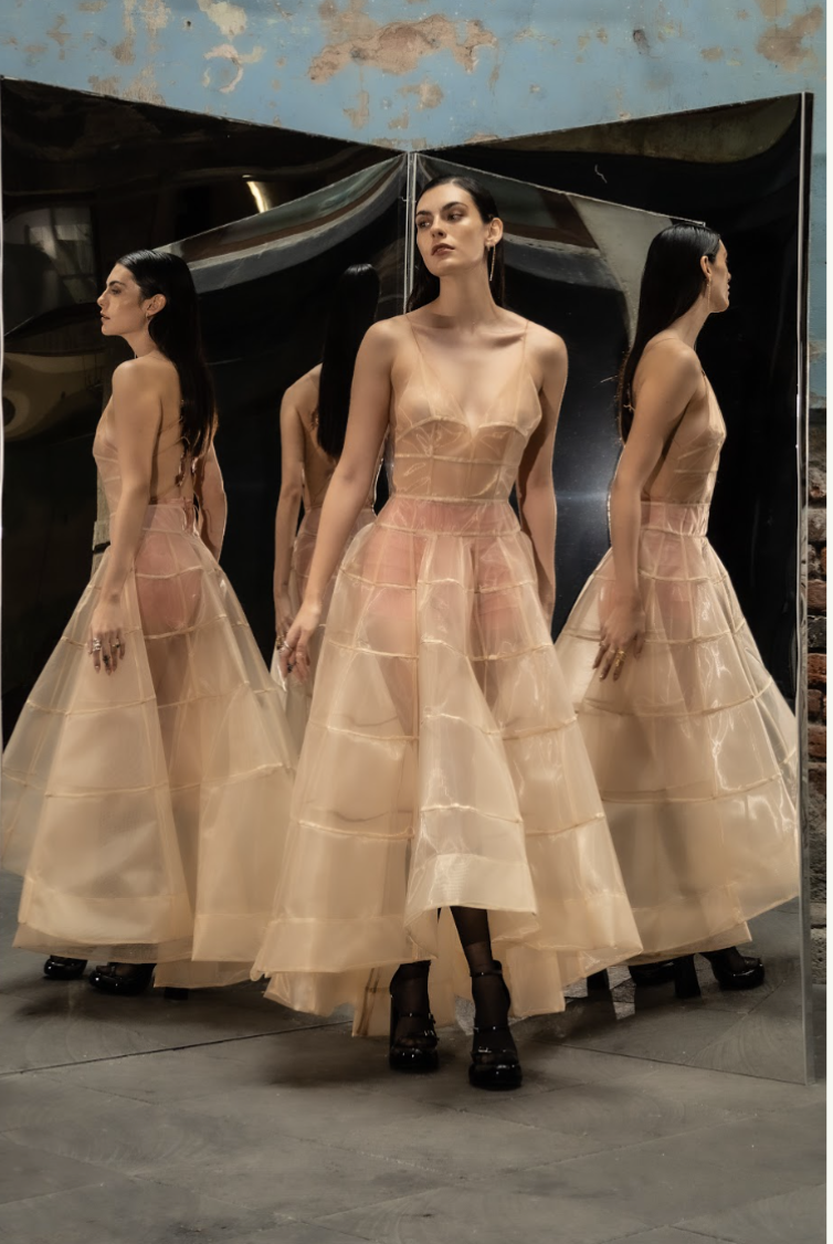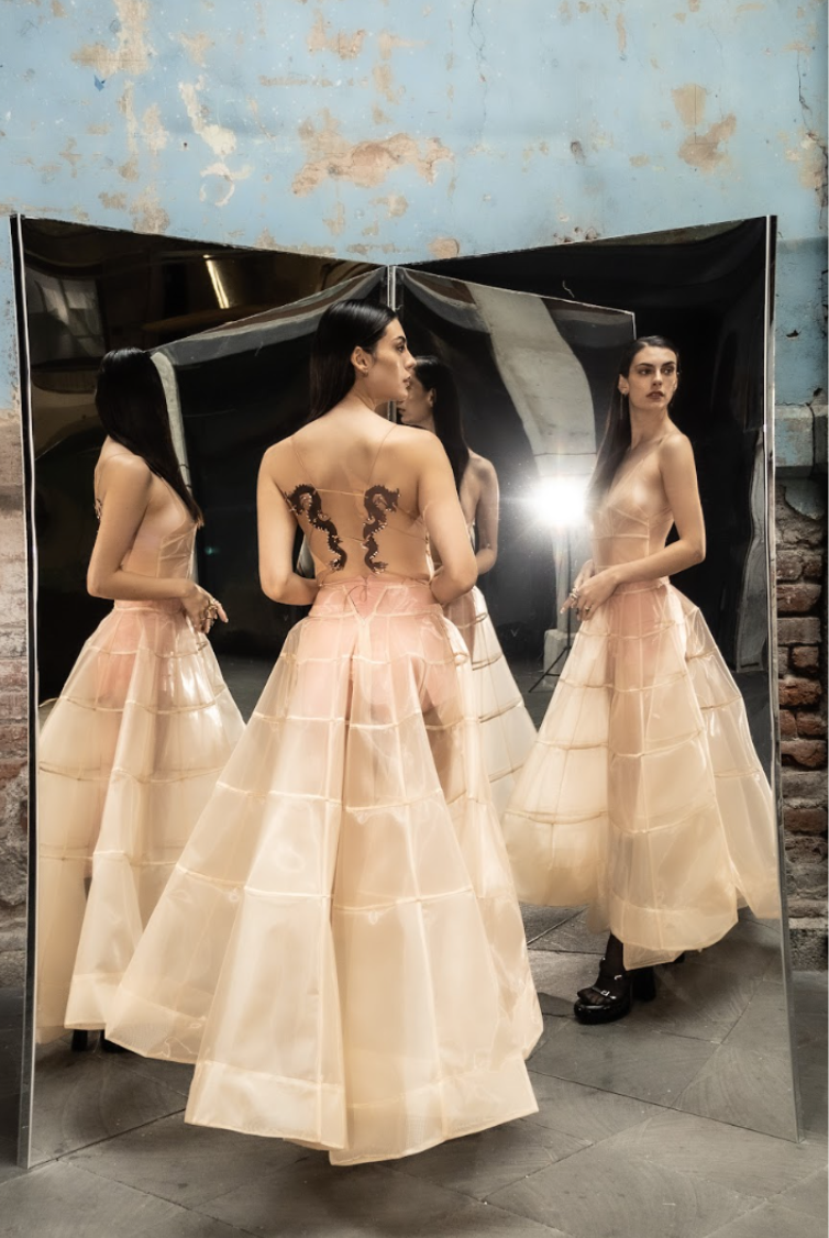 Vestido de malla rigida en capas sin espalda con dragones de acrilico como detalle.