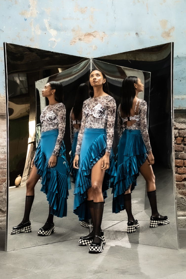 Falda con plisados al sesgo asimetricos a la cintura, detalle de corseteria en costado.