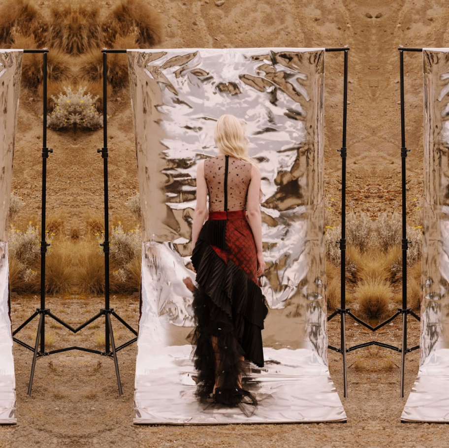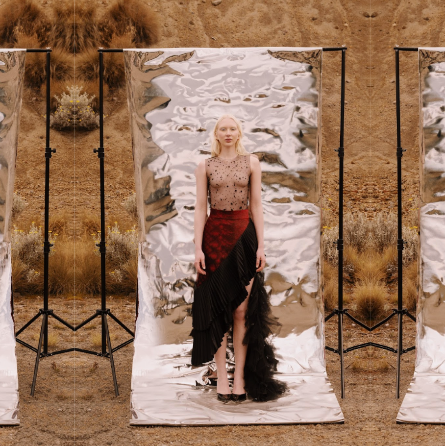 Falda de seda al sesgo teñida a mano con olanes plisados y falda complemento de tull compuesta de escarolas fruncidas creando detalle de volumen en costado.