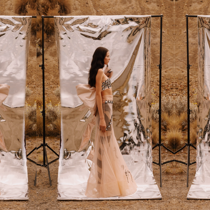 Una pieza etérea que celebra la fantasía y el trabajo artesanal. Esta falda de tul en tono nude, diseñada por Alexia Ulibarri, destaca por su silueta fluida y su confección en capas suaves que aportan movimiento y ligereza.