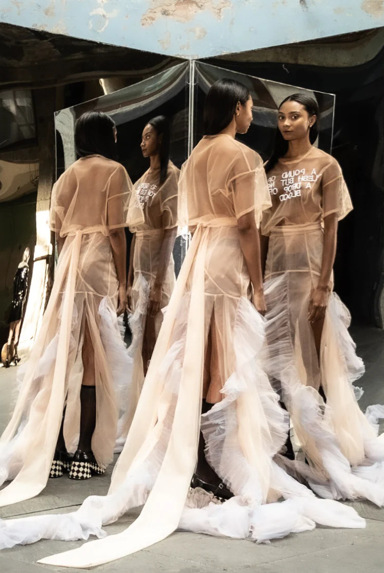 Falda maxi con escarolas plisadas y aberturas, detalle de corseteria en cadera.