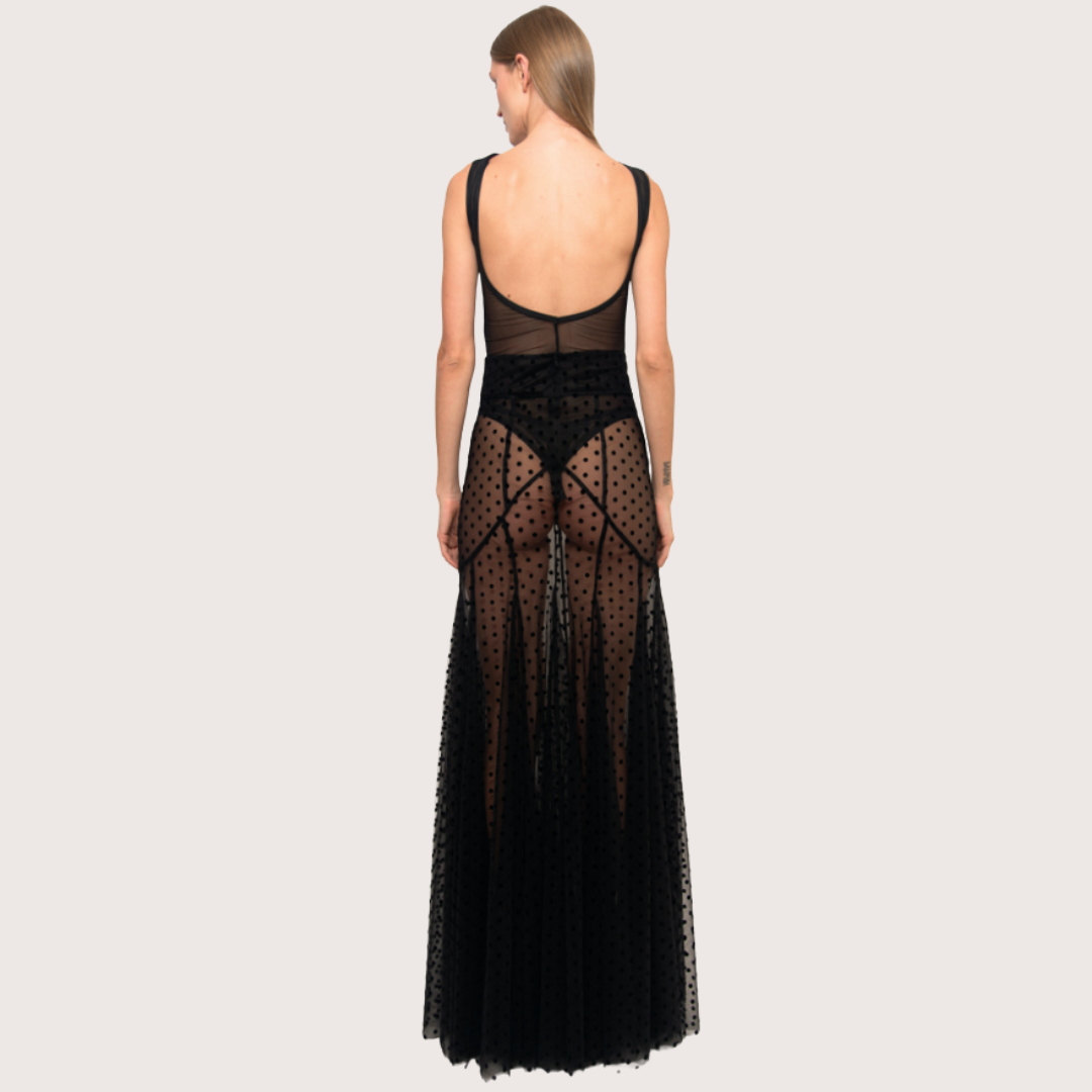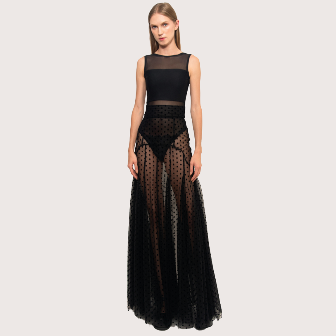 Falda larga de tull Point désprit, tiro alto texturizada con puntos, y apicaciones de godettes que crean volumen inferior y contraste al generar una saturación de color. Cuenta con cierre trasero y una estructura para mejor ajuste al cuerpo.