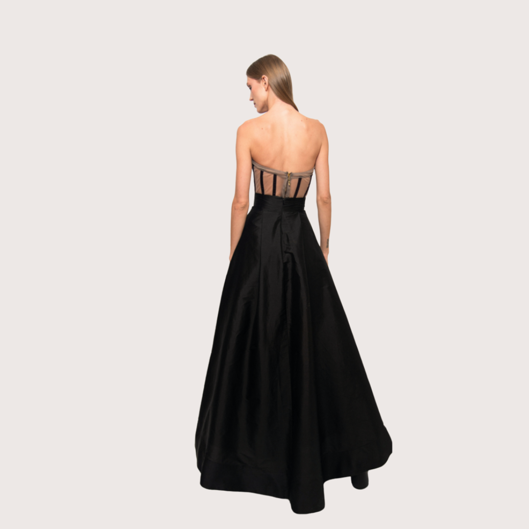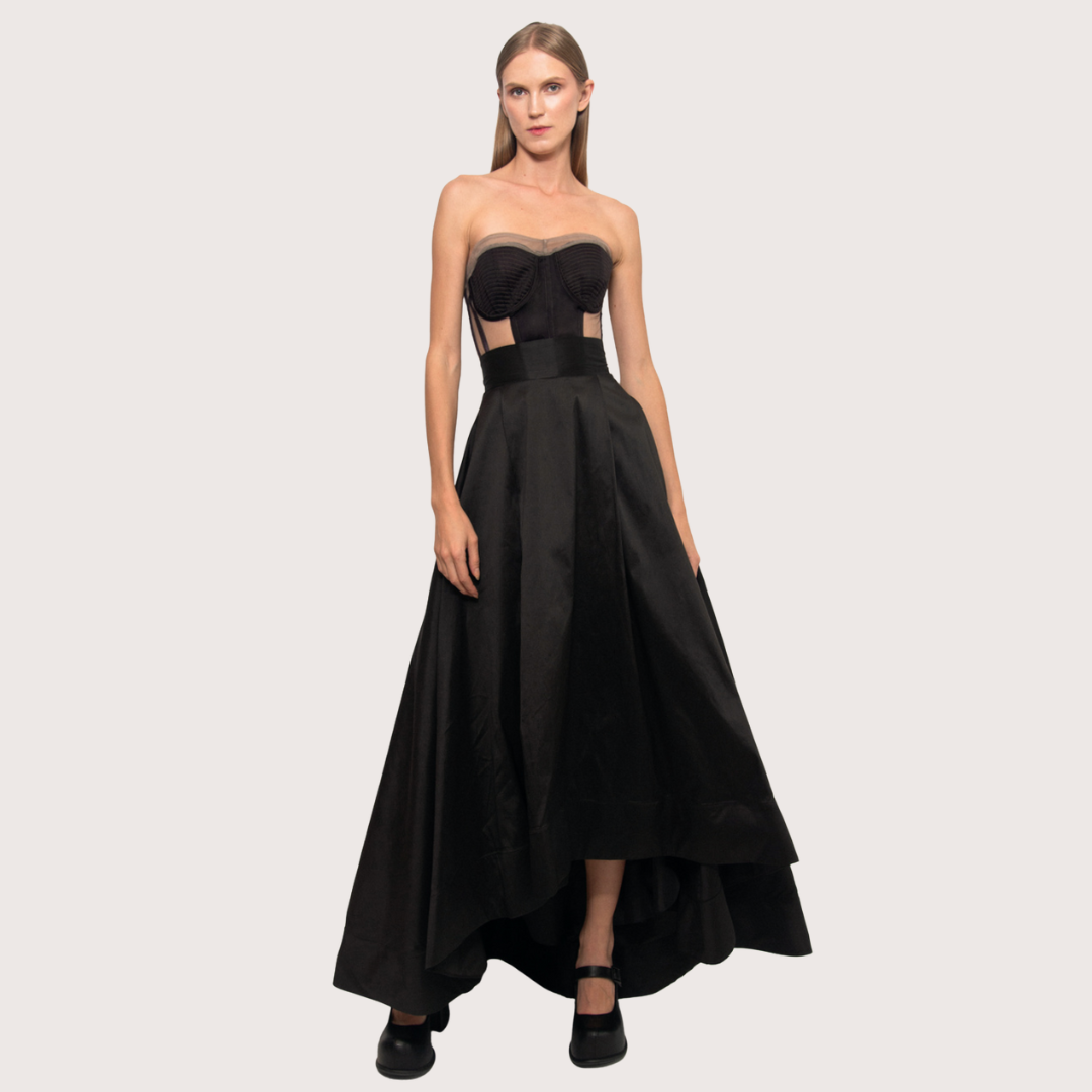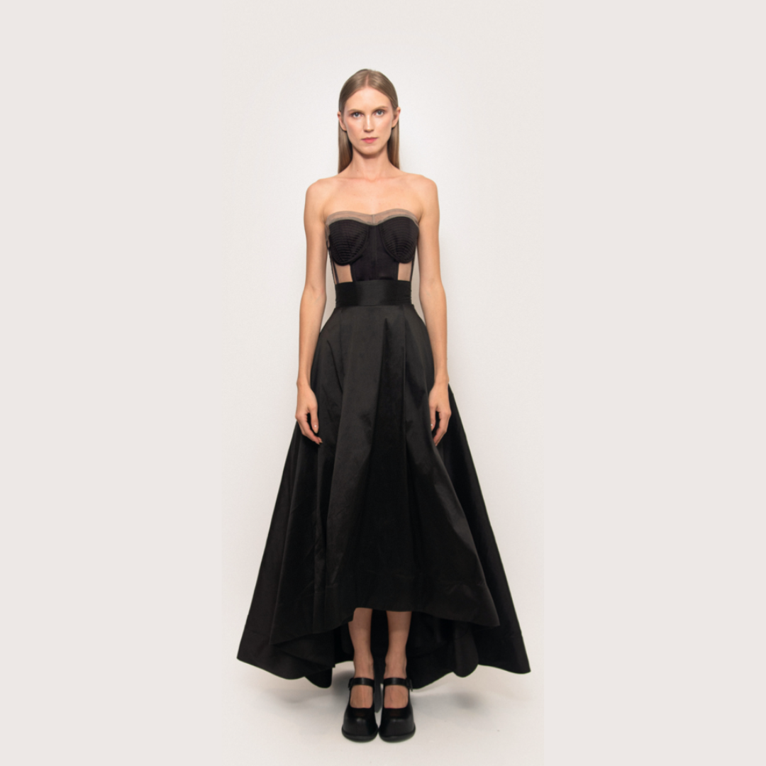 Falda corte A, circular con gran amplitud y mayor longitud trasera, así como ajuste a la cintura, que enfatiza la silueta femenina, y alarga las piernas gracias al juego de alturas de la terminación de la prenda.