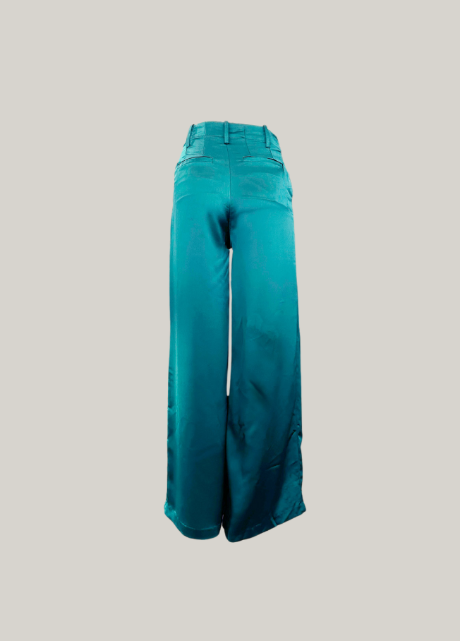 Pantalón palazzo de satén verde con tablones – Claudia Álvarez x Alexia Ulibarri