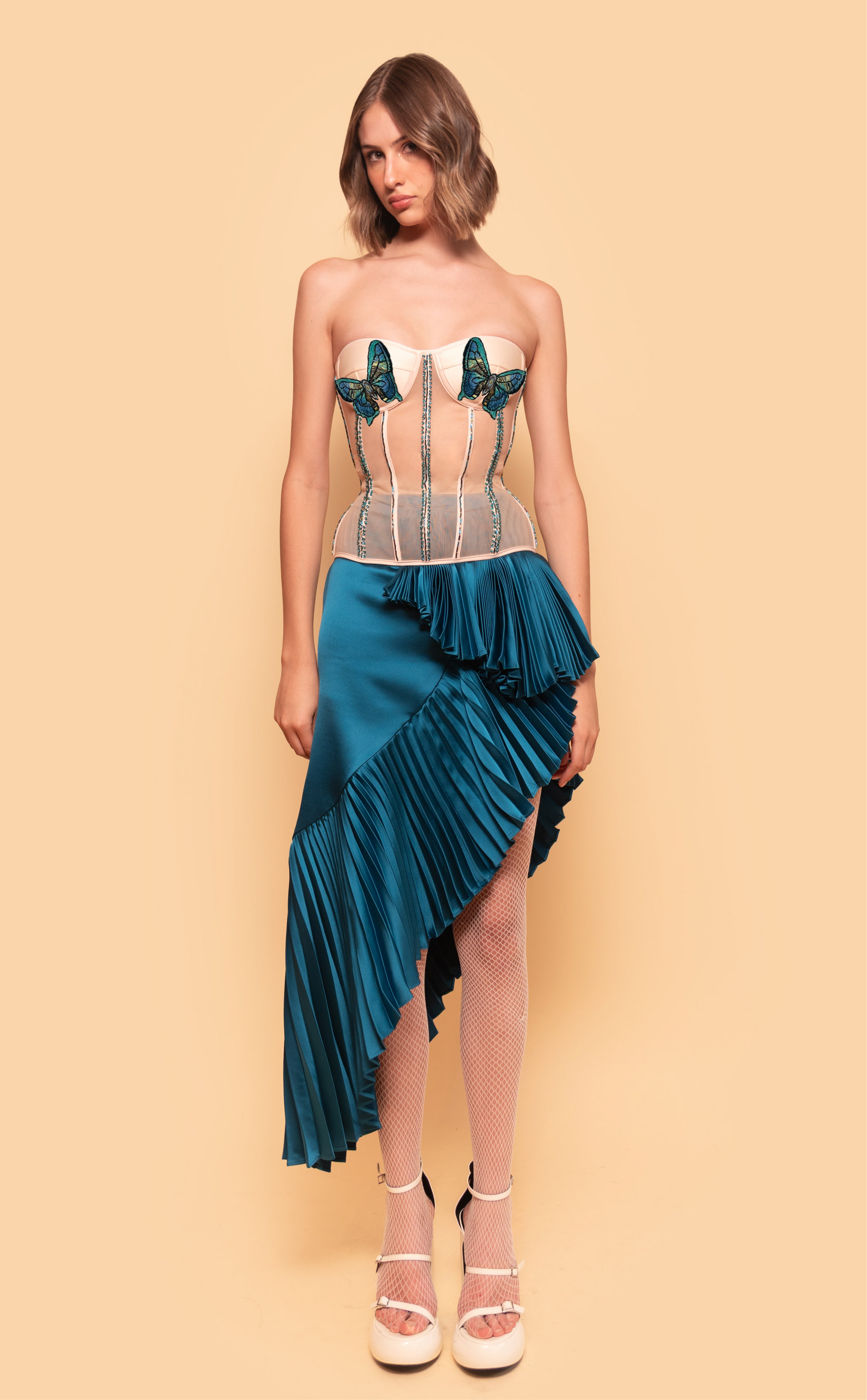 La silueta más icónica de Alexia Ulibarri, esta falda nace de un patrón victoriano reinterpretado con un giro contemporáneo. Con corte asimétrico, plisado degradadro, su construcción escultural aporta movimiento, feminidad y sofisticación tropical. Llévala con corsets, camisas abiertas o tops minimalistas para looks de alto impacto.