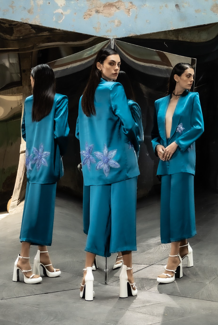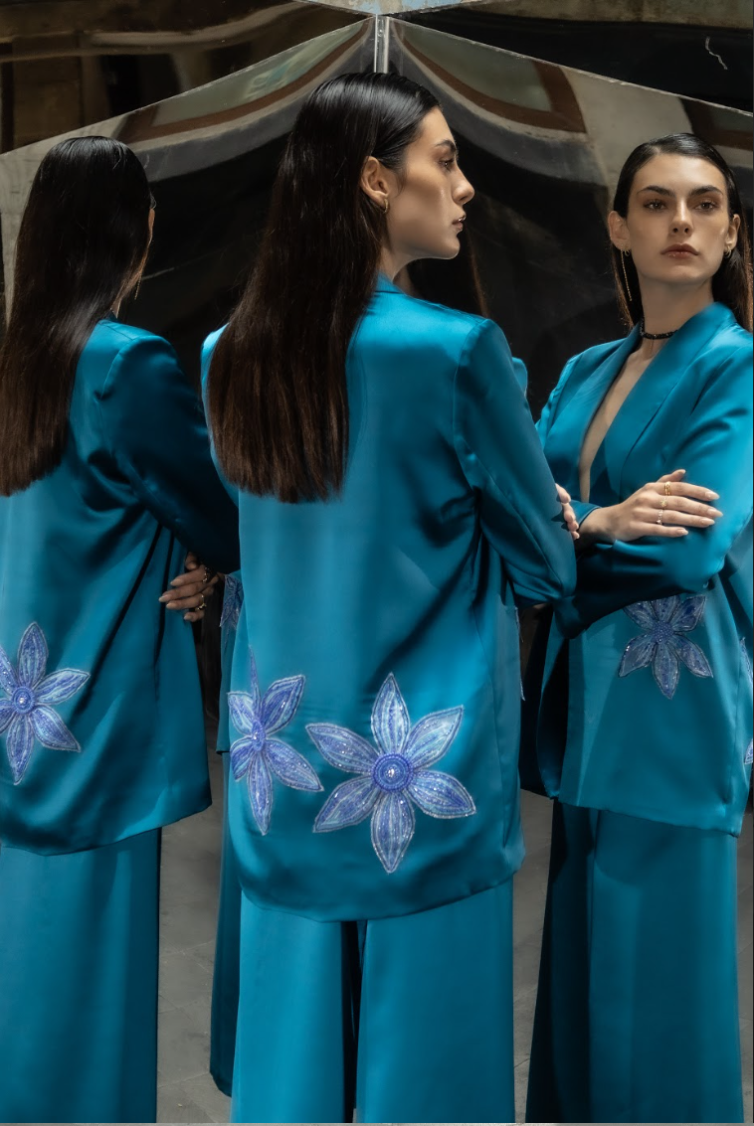 Saco de saten semi sastreado fit“Loose”bordado a mano. 19,500 MXN