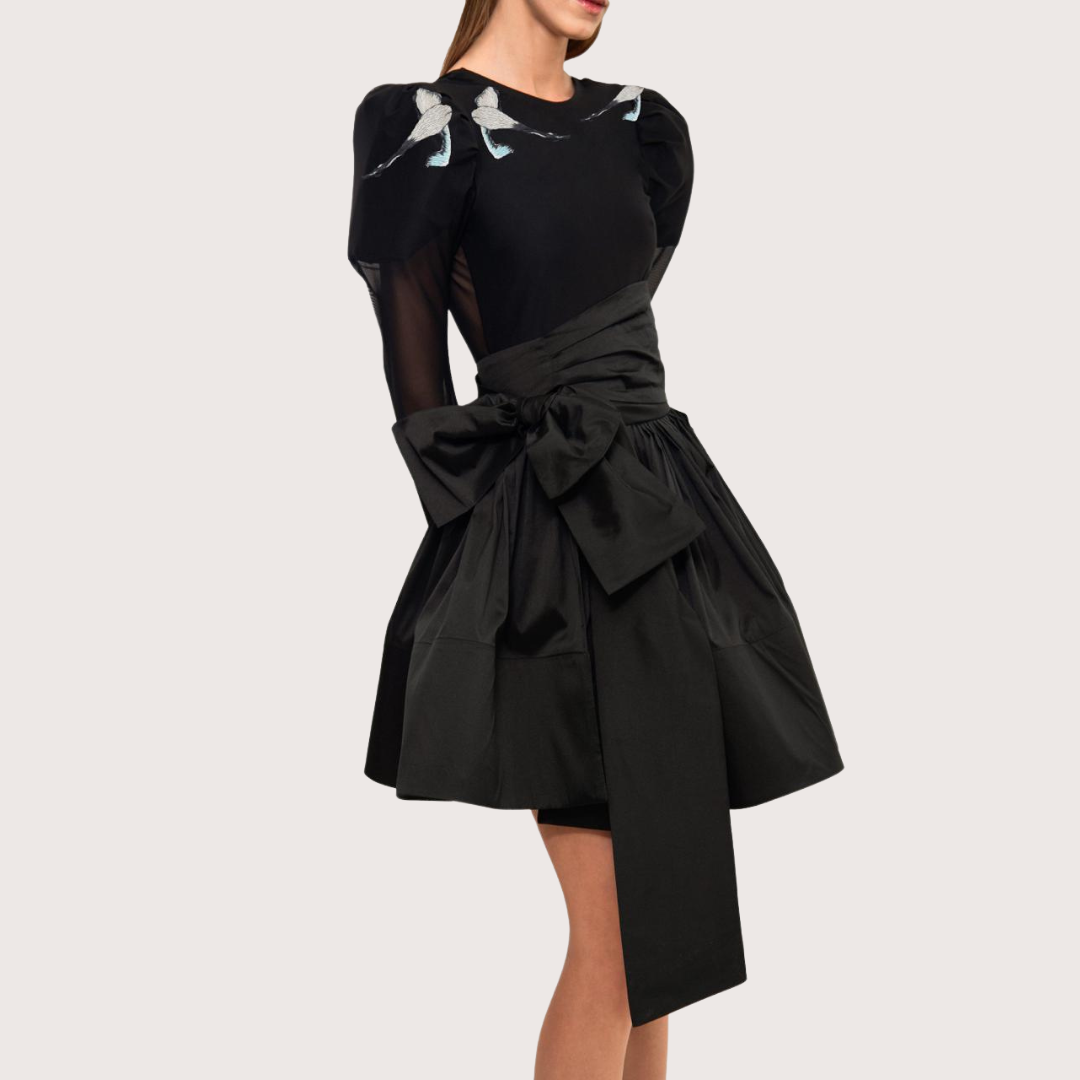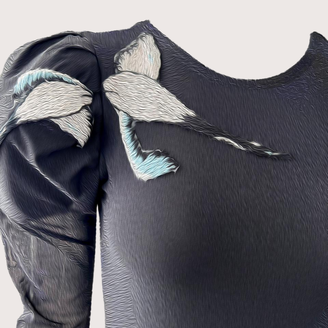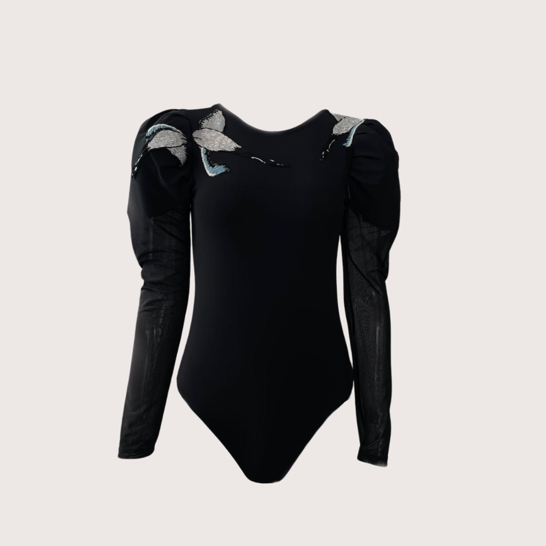 Body con espalda descubierta, mangas aglobadas y bordado de garzas, una prenda en perfecto balance entre la sensualidad del escote y lo coqueto de la silueta.