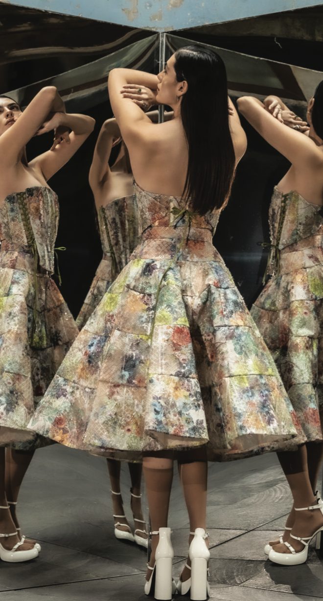 Falda con amplitud creada por paneles de encaje rebordado con lentejuelas metalicas.