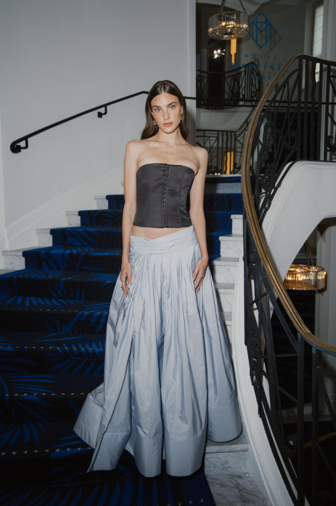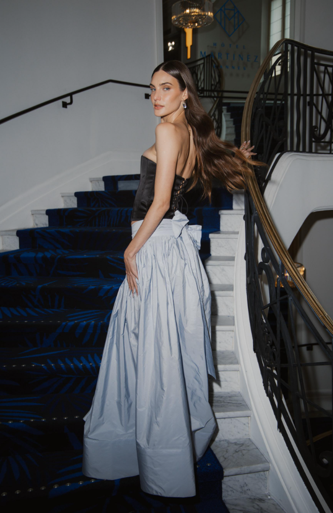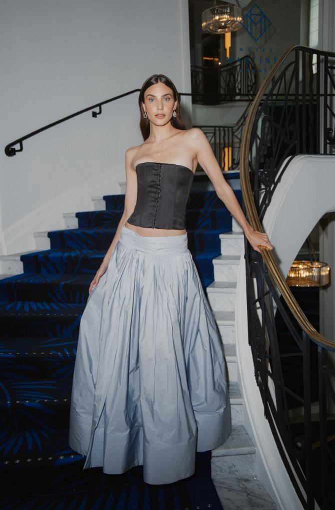 Diseñada para volar con cada paso, esta falda amplia confeccionada en tafetán de textura ligera combina drama y sofisticación. Su volumen arquitectónico creado por múltiples mini tablones y el acabado ligeramente brillante ofrecen un look etéreo y majestuoso, ideal para ocasiones especiales.