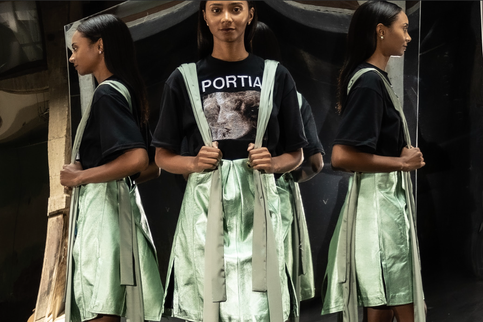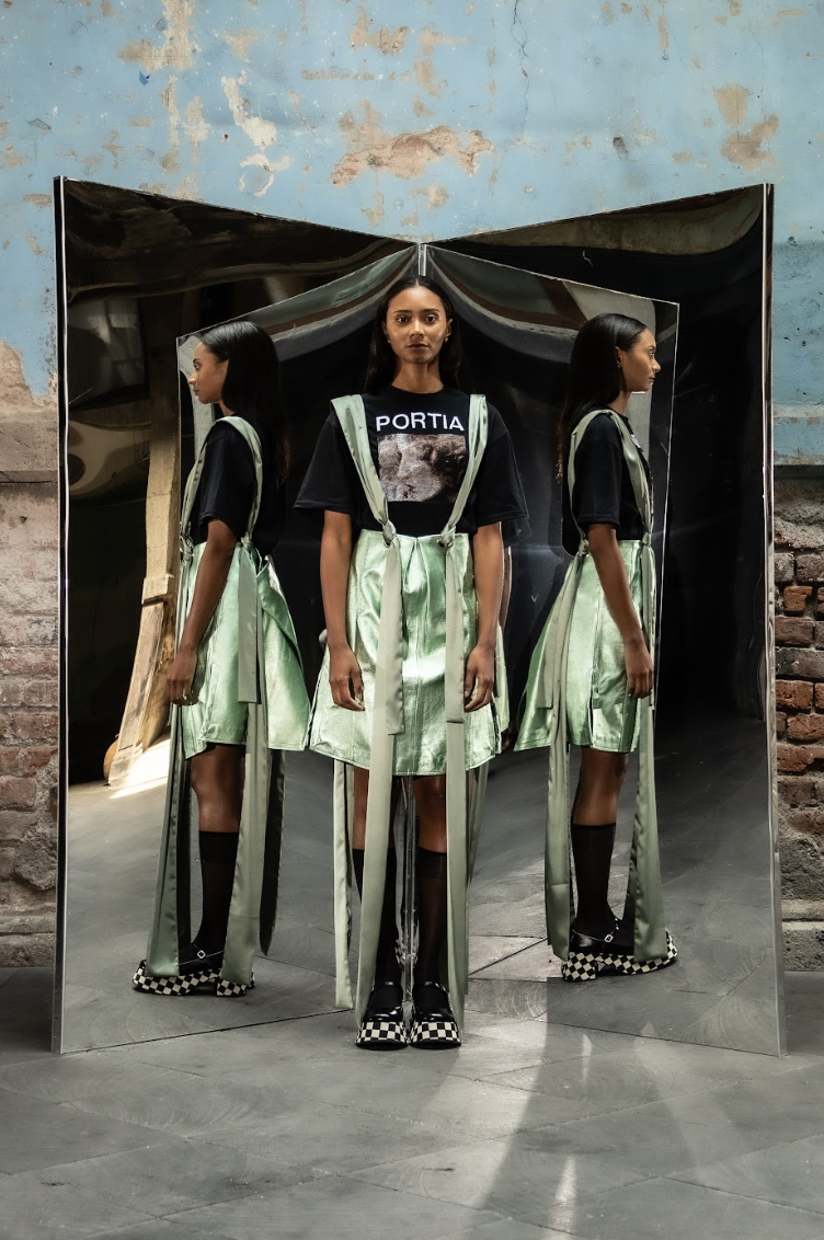 Falda envolvente de piel metalica con tirantes de satin y ojillos.
