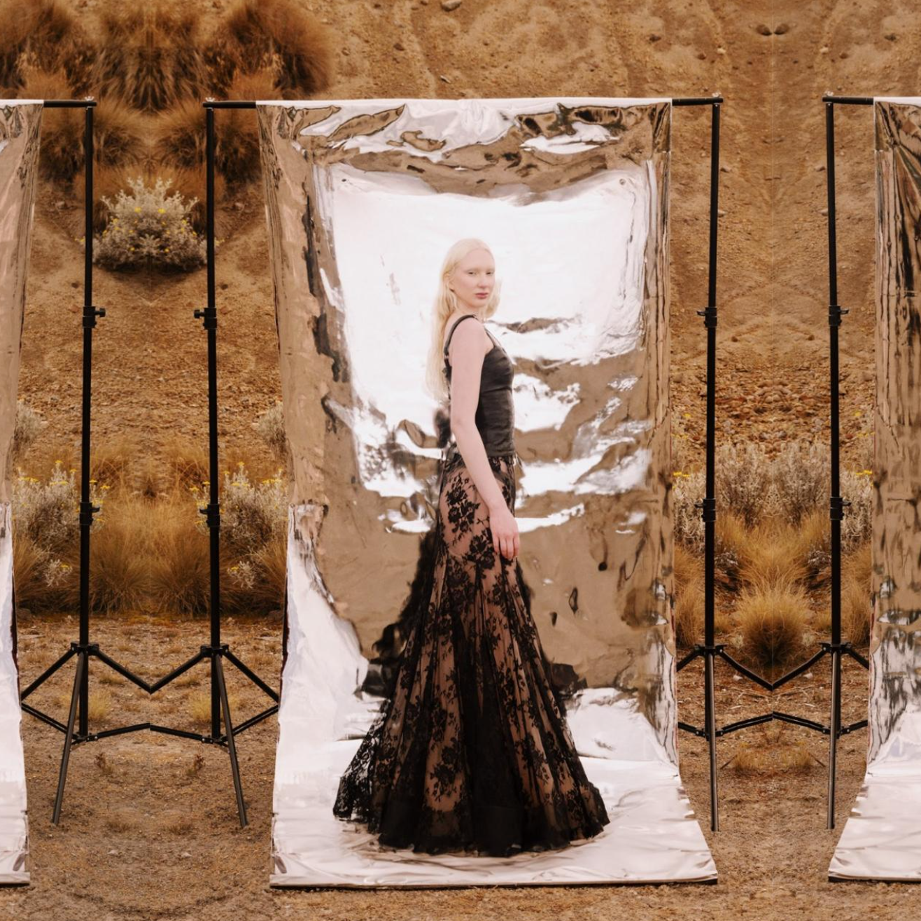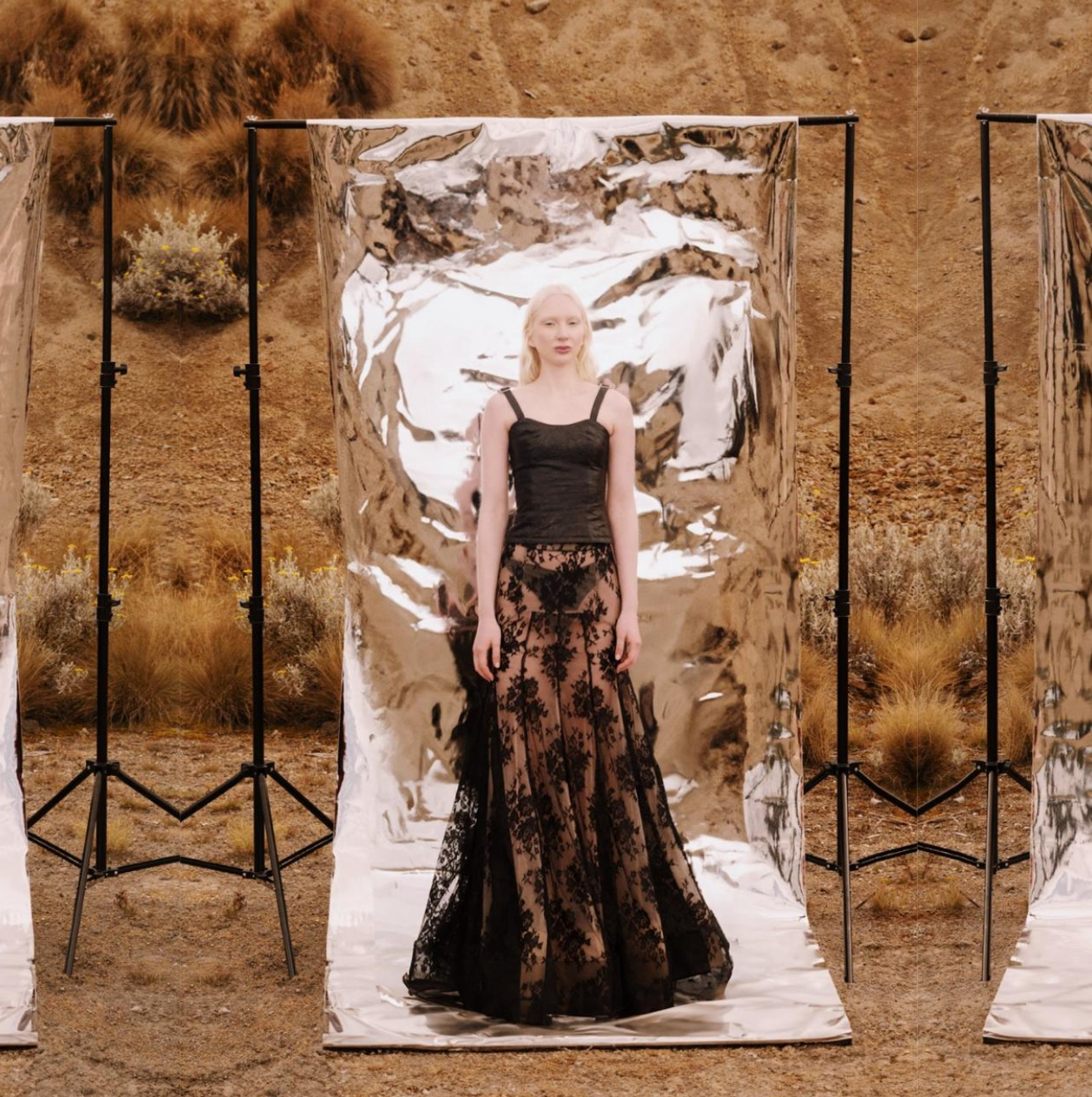 Una pieza dramática y etérea, esta maxi falda confeccionada en encaje negro fino con forro nude y tul estructural eleva cualquier silueta.