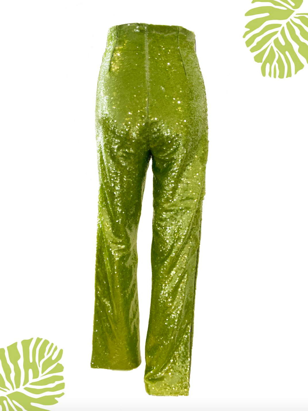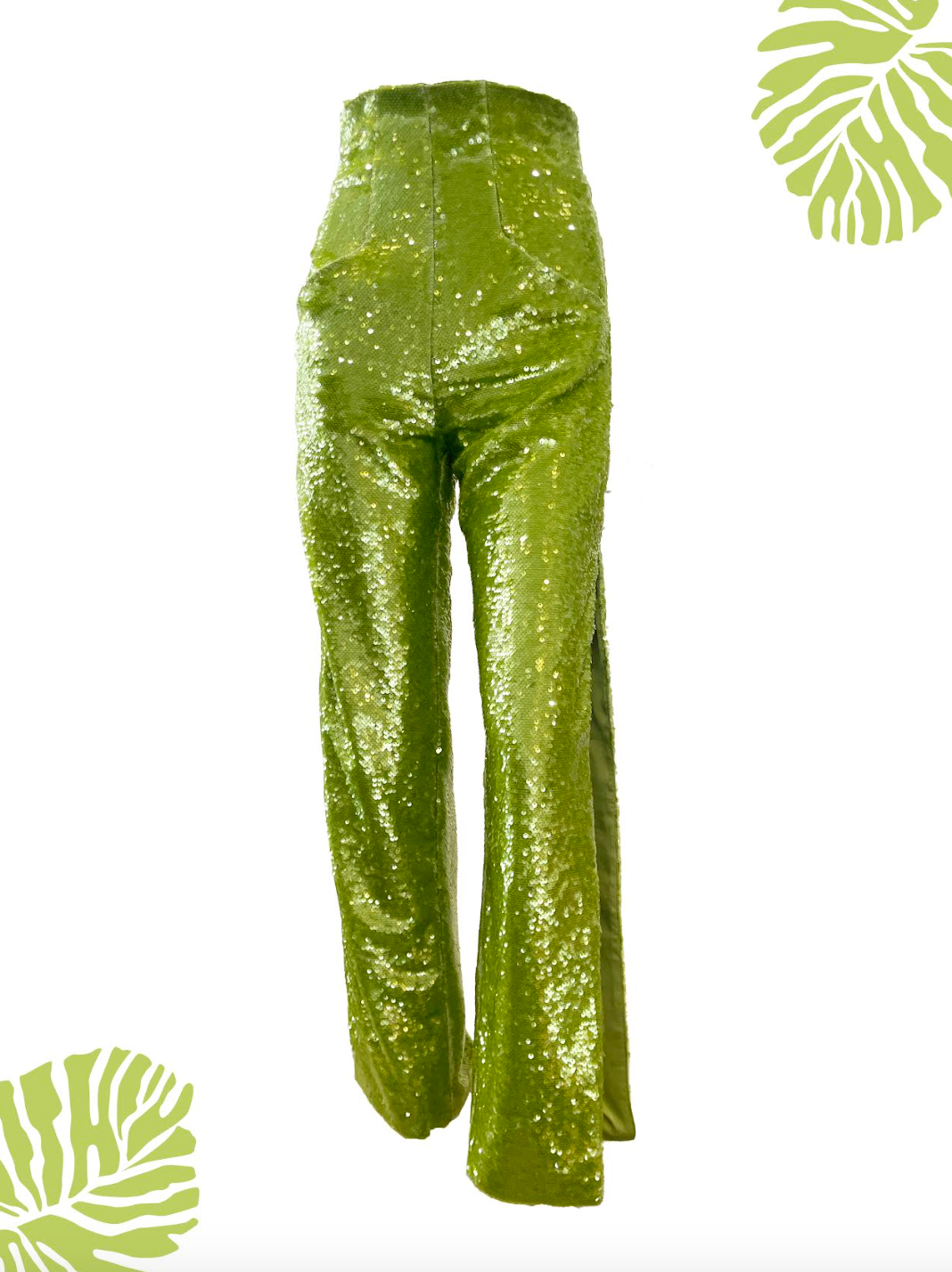 Pantalón MOORE pantalón de lentejuelas color verde ácido con aberturas en costados, largo al tobillo.