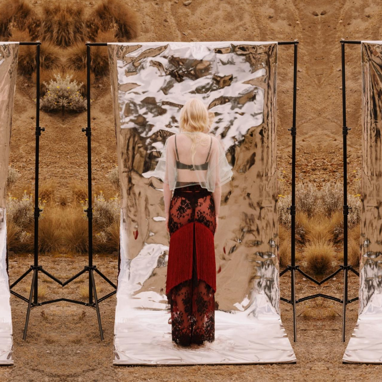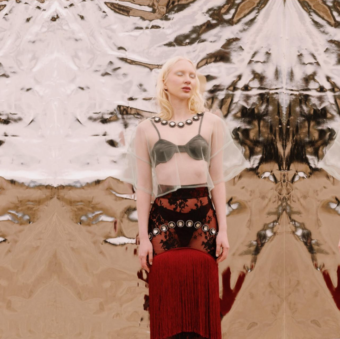 El cuello está rebordado a mano con discos metálicos que simulan cristales, aportando brillo y textura con un toque futurista.