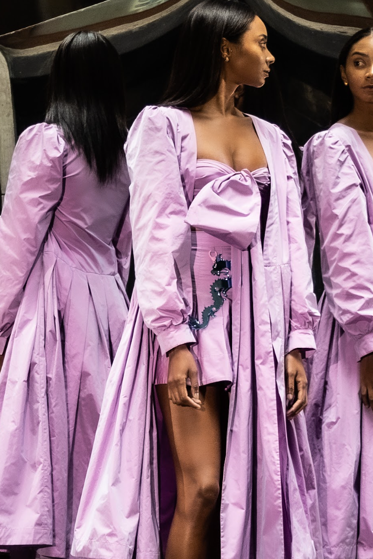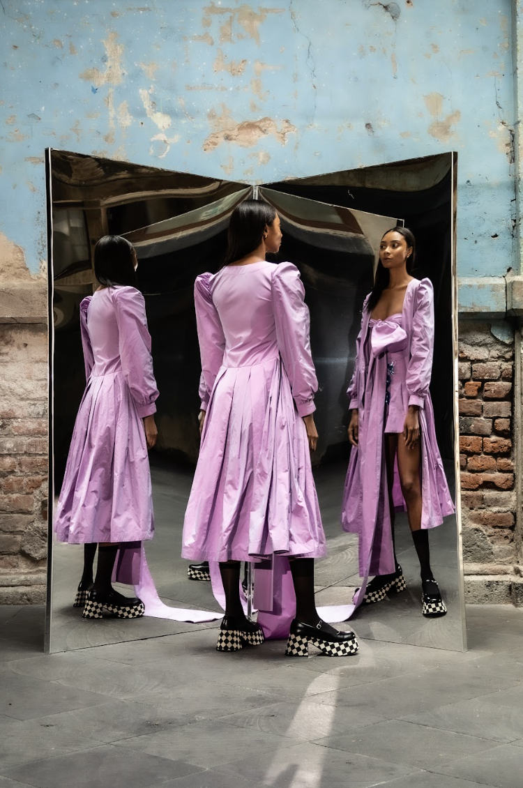 Capa tableada de tafetan con amarres y mangas aglobadas.