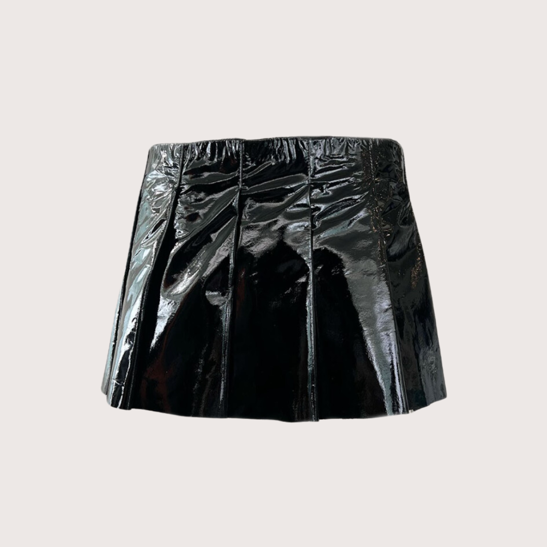 Falda es de charol de piel, presenta un diseño de pliegues, que brindan volumen y movimiento, lo cual suaviza el aspecto estructurado del vinilo. Esta minifalda es ideal para un estilo audaz y contemporáneo, perfecta para destacar en cualquier ocasión.