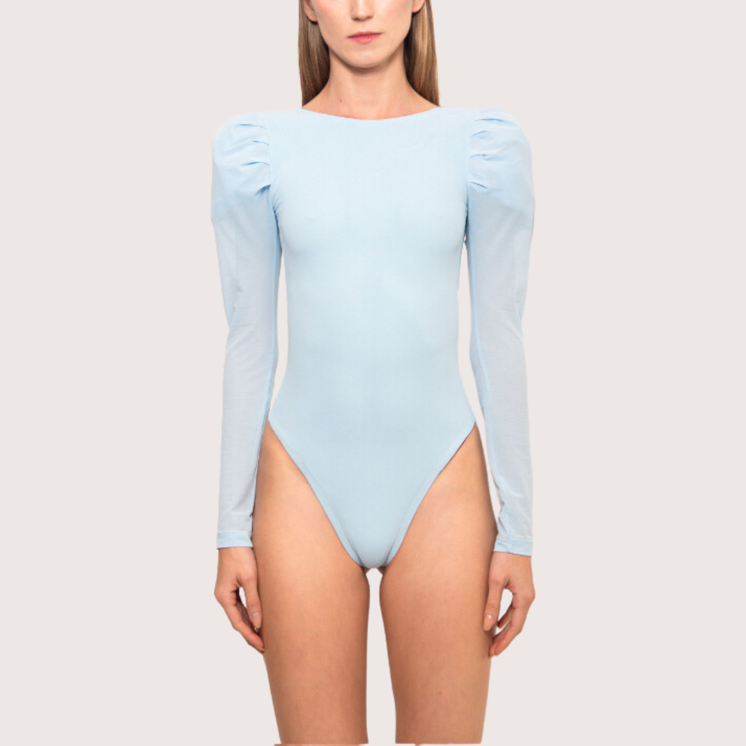 Body con espalda descubierta, mangas aglobadas y bordado de garzas, una prenda en perfecto balance entre la sensualidad del escote y lo coqueto de la silueta.
