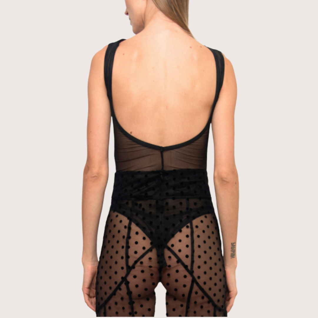 Body “second skin” con contrastes en mesh, busca crear una prenda sensual y versátil para elevar cualquier outfit.
