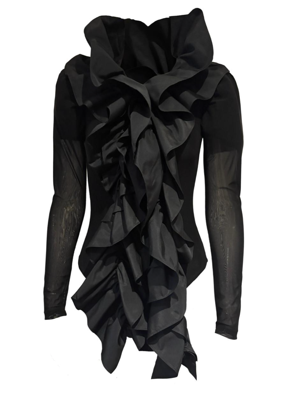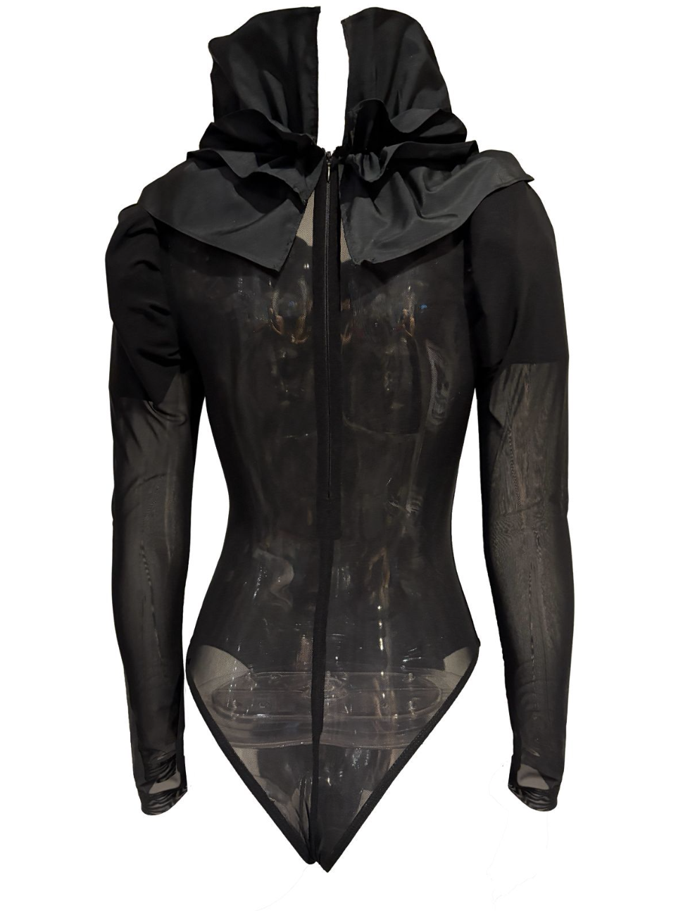 Body confeccionado en mesh y lycra con un espectacular olán fijo de tafetán que recorre el frente, creando un efecto escultural y dramático. Presenta mangas con volumen y transparencias que aportan sensualidad y sofisticación, mientras que la base de lycra ofrece un ajuste cómodo y favorecedor. Una pieza statement ideal para looks nocturnos y editoriales.